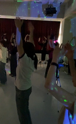ミラーボールがきらきら光る中、音楽に合わせて体を動かす時間を楽しみました。