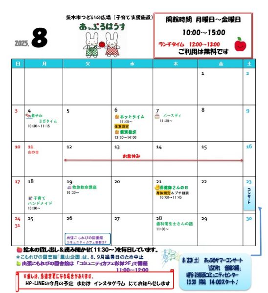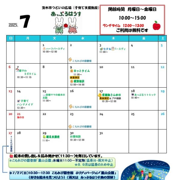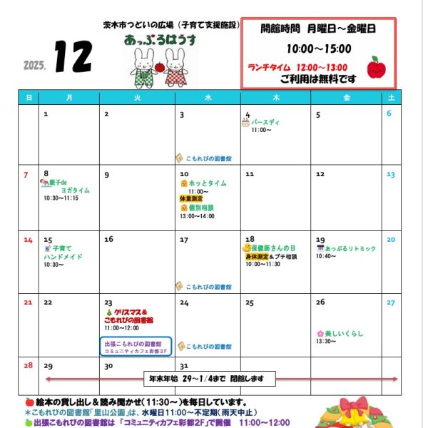 【利用案内】利用は無料です。予約不要。茨木市以外の方もご利用頂けます。利用対象 0歳児~未就学児とその保護者開館時間 10:00~15:00 入退室自由休館日 土日祝日・お盆・年末年始