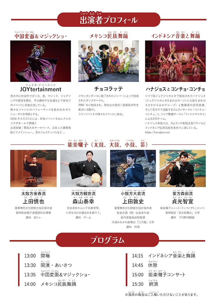 メキシコ民族舞踊、インドネシアの伝統音楽、そして日本の能楽囃子と、各国・各地域の文化を体感できる多彩な内容をお届けしました。どの演目も見ごたえがあり、観客の皆さまが引き込まれる時間となりました。